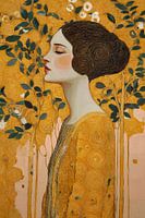 Het geheel ademt een sfeer van symboliek en mystiek: de vrouw is zowel mens als icoon, zowel kwetsbaar als verheven. Het goudgeel staat symbool voor licht, warmte en eeuwigheid; de bladeren verwijzen naar groei en vergankelijkheid; en de geometrische patronen tillen haar uit het alledaagse, richting het tijdloze domein van de verbeelding.