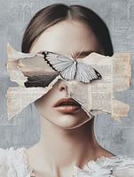 "Dromen in Fragmenten. Dit kunstwerk toont een vrouwelijk gezicht gedeeltelijk bedekt met gescheurde stukken papier en een delicate vlinder die haar ogen bedekt. Het papier lijkt oude teksten en afbeeldingen te bevatten, wat een gevoel van vergankelijkheid en herinnering oproept. De combinatie van de zachte, natuurlijke tinten en de fragiele elementen zoals de vlinder en het papier creëren een poëtische sfeer die introspectie en stilte uitstraalt. Het werk lijkt te spelen met de ideeën van identiteit, herinneringen, en de manier waarop we onszelf zien door de lens van het verleden en onze dromen.
