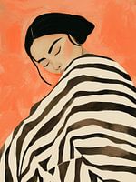 Een serene illustratie van een vrouw met gesloten ogen, gehuld in een vloeiende zwart-wit gestreepte stof tegen een gedurfde, warme koraalkleurige achtergrond. Het contrast van zachte expressie en opvallende patronen creëert een balans tussen kalmte en intensiteit