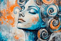 Met zachte, vloeiende lijnen en een harmonieuze kleurencombinatie van blauw en oranje straalt het kunstwerk een bijna hypnotiserende rust uit. De gesloten ogen en spiraalvormige krullen geven de figuur een mystieke uitstraling. Perfect als blikvanger in de woon- of slaapkamer, nodigt het uit tot ontspanning en zelfreflectie.