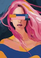 Modern abstracte afbeelding van een minimalistisch portret van een vrouw met roze haar in een blauwgele jurk. Verscholen achter rechthoeken van okergeel, blauw en roze droomt zij haar mooiste dromen. Complementerende kleurstelling in roze, blauw en geel. Simplistisch en toch uitgesproken. Passend bij diverse stijlen en trends, zoals Modern Abstract, Kleurrijk, Modern, Portret. Artist: Bianca ter Riet