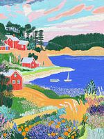 De kunstwerken zijn digitale vertalingen van verschillende materialen, zoals olieverf, acryl, stiften of potlood. De landschappen zijn opgebouwd uit speelse patronen—lijnen, stippen en strepen—die de compositie tot leven brengen. De eenvoudige, grafische vormen geven de natuur een moderne en dromerige uitstraling. Het voelt alsof je door een raam kijkt naar een zonnige dag waarin alles harmonieus samenkomt.