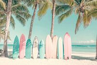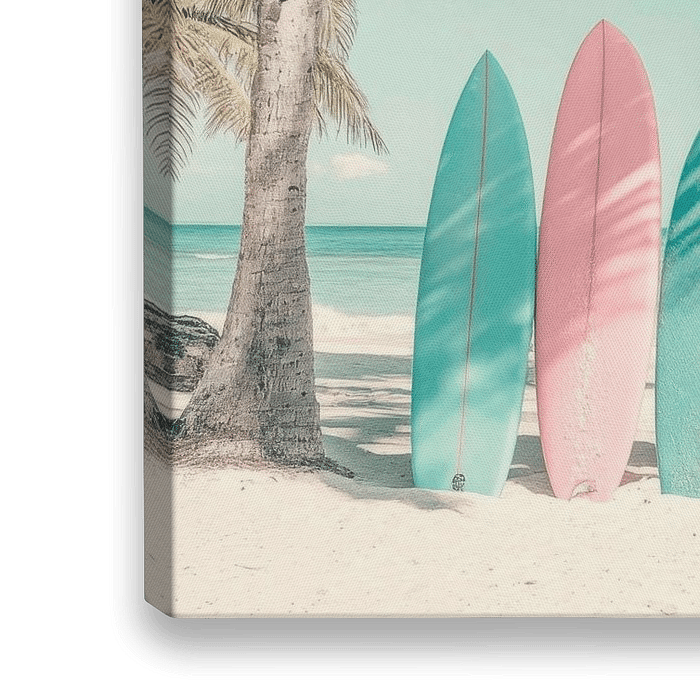 Een zacht briesje speelt met de palmbomen, terwijl pastelkleurige surfplanken in een harmonieuze opstelling op het zand staan. Hun zachte tinten roze en mint harmoniëren perfect met de helderblauwe zee op de achtergrond. Dit creëert een gevoel van ontspanning en avontuur, uitnodigend voor zowel surfers als dromers.