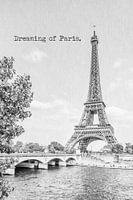 Met zijn 324 meter domineert de Eiffeltoren in Parijs het stadsbeeld. Het is een van de meest bezochte bezienswaardigheden ter wereld. Klassieke monochrome impressie van Parijs aan de Seine met typografie "Dromen van Parijs".