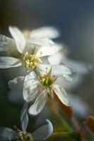 Op de foto zie je een close-up van een bloesemtak, met de nadruk op twee bloemen die prominent in het midden van het beeld staan. Het licht valt zachtjes op de witte bloemblaadjes, waardoor ze bijna doorschijnend lijken. De achtergrond is onscherp, met vage grijze en blauwe tinten die een rustige en dromerige sfeer creëren.