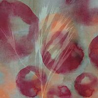 Moderne semi-abstracte botanische kunst. Mixed media - monotype print van bladeren, planten, bloemen en abstracte texturen, penseelstreken, vormen en lijnen. Collage in warme kleuren.Romantisch, Eclectisch, Boheems, Modern chic, Scandinavische woonstijl.