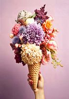 Deze betoverende afbeelding toont een ijshoorntje in de hand waaruit levendige bloemen bloeien in pasteltinten. Een afbeelding die de zintuigen verleidt en de verbeelding aanwakkert - perfect om een unieke sfeer aan je…