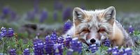De vos ligt met zijn ogen gesloten en een vredige uitdrukking op zijn gezicht, wat de kalmte en sereniteit van het moment benadrukt. De bloemen, mogelijk lupines, omringen de vos en creëren een…