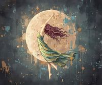 Dit kunstwerk toont een dromerige en sierlijke vrouw die lijkt te zweven of dansen voor een grote volle maan. Haar lange, golvende paarse haren waaien vrij in de lucht en ze draagt een zwierige groene jurk die beweging en lichtheid uitstraalt. De achtergrond is donker, met tinten van diepblauw en grijs, waarin kleurrijke verfspatten in…