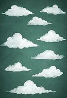 Flinterdunne witte wolken drijven sereen over een groenblauwe vlakte met textuur en roepen een gevoel van rust en de stille schoonheid van een met sterren verlichte nachthemel op. Elke wolk heeft een unieke, zachtgerande vorm en suggereert een vredige reis door de atmosfeer.