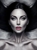 Met haar dromerige ogen, betovert ze op serene wijze de ruimte. Door de zachte kleuren, zal dit portret op een neutrale wijze een toevoeging leveren aan uw interieur.
