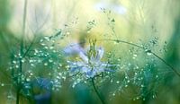 Een artistieke fotobewerking van meerder foto's doorelkaar (composiet). Gras met druppeltjes van de regen en een Juffertje in het groen in pastelkleuren.