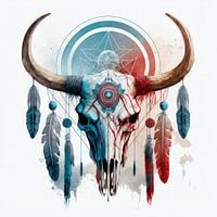 Laat je betoveren door de kracht van de wildernis in deze unieke vector illustratie van een geblakerde stierenschedel met veren en Zuid-Amerikaanse symbolen.