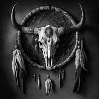 Laat je betoveren door de kracht van de wildernis in deze unieke vector illustratie van een geblakerde stierenschedel met veren en Zuid-Amerikaanse symbolen