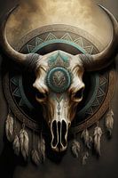 Laat je betoveren door de kracht van de wildernis in deze unieke vector illustratie van een geblakerde stierenschedel met veren en Zuid-Amerikaanse symbolen