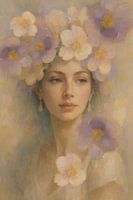 Dit fine-art portret toont een vrouw met een bloemenkrans in zachte pastelkleuren zoals lila, crème en goudgeel. Haar dromerige uitstraling en de schilderachtige stijl maken dit kunstwerk een perfecte blikvanger voor elk interieur. Geschikt voor liefhebbers van romantische kunst, vintage portretten en digitale schilderijen met een klassieke uitstraling. Ideaal als kunst aan de muur in je woonkamer, slaapkamer of hal.