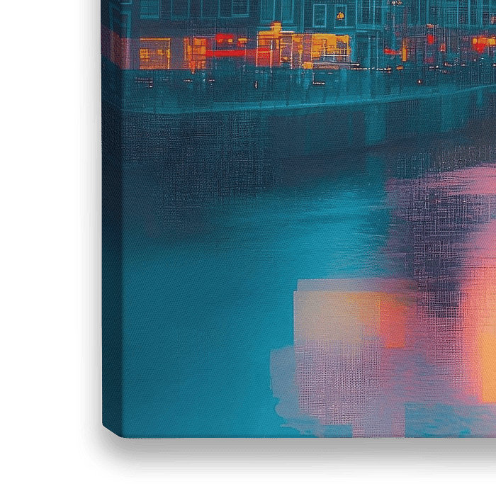 Deze abstracte afbeelding van Amsterdam onthult de magische schoonheid van de stad bij zonsondergang, met stralende kleuren die het water en de architectuur in een dromerige sfeer weerspiegelen.