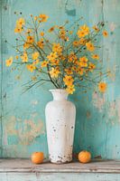 Een dromerig, Frans geïnspireerd stilleven met een vaas vol fijne, gele wilde bloemen en twee sappige sinaasappels op een verweerde houten plank. De zacht turquoise achtergrond met peeling paint geeft dit werk een authentieke, landelijke sfeer. Een ode aan eenvoud en schoonheid in het alledaagse. Perfect voor liefhebbers van vintage interieurs, cottagecore en rustieke wanddecoratie.