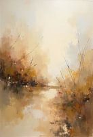 Dit betoverende kunstwerk, "Dromerig Landschap", is een perfecte harmonie van zachte beige- en warme goudtinten die de kijker uitnodigen om zich onder te dompelen in een serene wereld. Met zijn dromerige uitstraling en subtiele, organische vormen, roept het een gevoel van rust en contemplatie op. De delicate takken die zachtjes in de lucht zweven, creëren een poëtische verbinding tussen de aarde en de lucht, terwijl de reflecties op het water de zintuigen prikkelen. Dit schilderij onderscheidt zich door zijn unieke kleurgebruik en de impressionistische techniek die een warme en uitnodigende sfeer opwekt. De inspiratie komt voort uit de natuurlijke muziek van serene landschappen, waarbij elke penseelstreek een verhaal vertelt van harmonie en verbinding met de natuur. Het kunstwerk is een ideale aanvulling voor moderne interieurs, van minimalistische woonkamers tot gezellige werkruimtes, en voegt een vleugje verfijning en emotie toe aan elke ruimte. Laat je omarmen door de tijdloze elegantie en de kalmerende aura die dit schilderij uitstraalt – een echte meerwaarde voor je interieur.