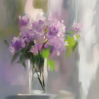 Een dromerig en impressionistisch bloemstilleven waarin licht en kleur op subtiele wijze samenkomen. De zachte, paarse bloemen in een glazen vaas worden omhuld door een wazige, sfeervolle achtergrond die de indruk wekt van een raam met diffuus daglicht. De penseelstreken zijn los en vloeiend, waardoor de compositie een bijna etherische…