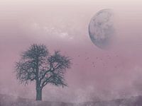 Zachte dromerige paarse kleuren in dit digitale landschap. Te zien zijn een boom waar de blaadjes al van zijn afgevallen, een prachtige heldere maan en een lichtgevend heelal. Vogels die naar de boom vliegen en een plekje zoeken voor de nacht.