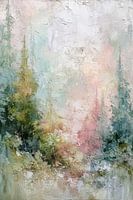 Een expressief abstract landschap in pastelroze, lichtgroen, beige en wit straalt rust en zachtheid uit. Een tijdloos tafereel dat sereniteit oproept en een lichte, kalmerende energie toevoegt aan de ruimte.