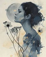 Dromerig portret met bloemen in kobalt blauw. Een bijzondere blikvanger. Kies zelf het formaat en materiaal bij dit werk en maak het helemaal passend voor jouw interieur.