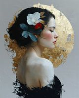 Dromerig portret met goud in de achtergrond. Bijzondere blikvanger waar je naar blijft kijken. Kies zelf het formaat en materiaal voor dit werk en maak het helemaal passend voor jouw interieur.
