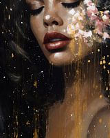 Dromerig portret met gouden accenten. Dit is een echte blikvanger voor je muur! Maak het helemaal naar wens door zelf de afmeting en het materiaal te kiezen.