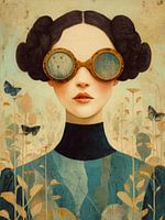 Een vrouw kijkt rustig de wereld in door grote ronde brillen met gouden randen. In de reflectie van het glas lijkt een dromerig landschap te leven, alsof ze kijkt naar een verborgen tuin vol licht en stilte. Haar donkere haar is zorgvuldig opgestoken, wat een gevoel van rust en elegantie oproept. De zachte tinten blauw en beige vloeien samen als waterverf, waardoor het geheel een poëtische sfeer krijgt. Rondom haar dansen vlinders tussen tere planten, alsof ze haar gedachten volgen. De vrouw lijkt even tijdloos als modern – een symbool van verbeelding en innerlijke rust. Haar blik is kalm, maar in haar ogen schuilt een verhaal. De matte achtergrond versterkt de vintage-achtige warmte van het beeld. Het portret voelt aan als een venster naar een andere wereld, waar natuur en droom naadloos in elkaar overlopen. Dit werk nodigt de kijker uit om even stil te staan, te ademen en te kijken met verwondering.