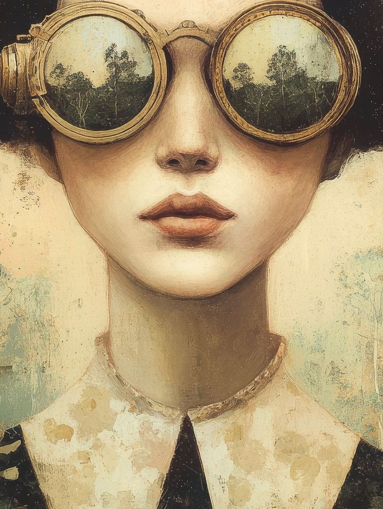 Dit kunstwerk toont een jonge vrouw die recht vooruit kijkt met een kalme, mysterieuze blik. Haar gezicht is zacht en helder geschilderd, omlijst door donkere, volle haren die in twee wolkenachtige vormen zijn samengebracht. Opvallend zijn de grote ronde steampunk-brillen die ze draagt; in de lenzen weerspiegelt zich een stille wereld vol bomen en natuur. Haar kleding is klassiek en elegant, met een donker kleed vol bladpatronen en een contrasterende witte kraag. Het geheel roept een gevoel van nostalgie en fantasie op, alsof ze deel uitmaakt van een verhaal tussen droom en werkelijkheid. De achtergrond is subtiel verweerd en doet denken aan oude muren of vergeelde bladzijden, wat het werk een tijdloos karakter geeft. Het contrast tussen het fragiele gelaat en de robuuste bril versterkt de spanning tussen kwetsbaarheid en kracht. Je voelt de stilte van een bos, maar ook de echo van een andere, denkbeeldige wereld. Het is een beeld dat de kijker uitnodigt om te dromen, te reizen in gedachten en nieuwe perspectieven te ontdekken.
