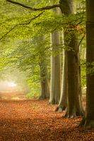 Foto van een boslaantje in de ochtend. Met mist in de verte. Frisse groene kleuren aan de bomen. En rood bruine bladeren op de grond.