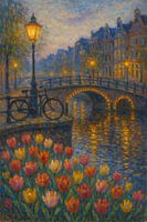 De avond valt over Amsterdam en het rustige ritme van de grachten begint te gloeien. Lantaarns glinsteren over de bruggen terwijl tulpen langs de rand bloeien en uitbarstingen van rood, koraal en oranje toevoegen aan het kalme blauwe water. Reflecties rimpelen als zijde en het vervagende daglicht verdiept zich tot indigo. Impressionistische textuur verandert het gewone in poëzie en transformeert licht in emotie.