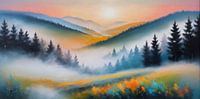 Laat je betoveren door de serene schoonheid van "Dromerige Dageraad", een expressief landschap dat de magie van de vroege ochtend vangt. De opkomende zon verlicht de zachte nevel die over de heuvels glijdt, waardoor een dromerig spel van licht en schaduw ontstaat. Diepe tinten blauw en groen in de dennenbomen contrasteren prachtig met de warme oranje en gele gloed van de ochtendzon, die langzaam de mist verdrijft.
