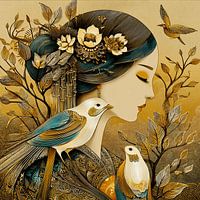 Poëtisch portret van vrouw met bloemen in het haar, omgeven door vogels in warme goud- en blauwtinten.