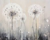 Paardenbloemen in een dromerige, abstracte stijl. De subtiele kleurovergangen van wit naar beige en grijs suggereren een delicate, serene atmosfeer. De stelen van de paardenbloemen zijn fijn en gestileerd, terwijl de pluisjes een gevoel van lichtheid en vergankelijkheid overbrengen.