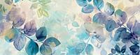 Dit kunstwerk toont een serene en etherische compositie van bladeren in verschillende tinten blauw, groen en paars, aangevuld met lichte pastelaccenten die het geheel een zachte, dromerige uitstraling geven.