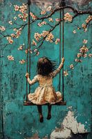 Een meisje op een schommel, omringd door bloesems, vangt de pure vreugde en onschuld van de kindertijd in een wereld vol kleuren en dromen.