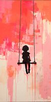 Dit werk belichaamt de zorgeloosheid en fantasie van de kindertijd met de afbeelding van een kind dat op een schommel zit, omhuld door een warme, roze gloed. De achtergrond, met zijn abstracte mengeling van witte en roze tinten, zorgt voor een dromerige sfeer die de toeschouwer uitnodigt om even te ontsnappen aan de realiteit. De donkere figuur van het kind contrasteert mooi met de zachte achtergrond, wat het geheel een speels maar toch mysterieus karakter geeft.