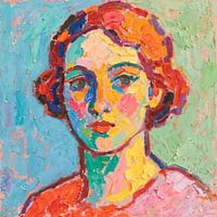 Dromerige Mia - Portretschilderij in eigentijdse kleuren - Toon je moed met dit moderne en abstracte kunstwerk, dat doet denken aan de grote werken van de expressionistische meesters. Kies zelf het formaat en het materiaal uit de vele opties. Verander je huis in een toevluchtsoord van kunst, precies zoals jij het wilt!