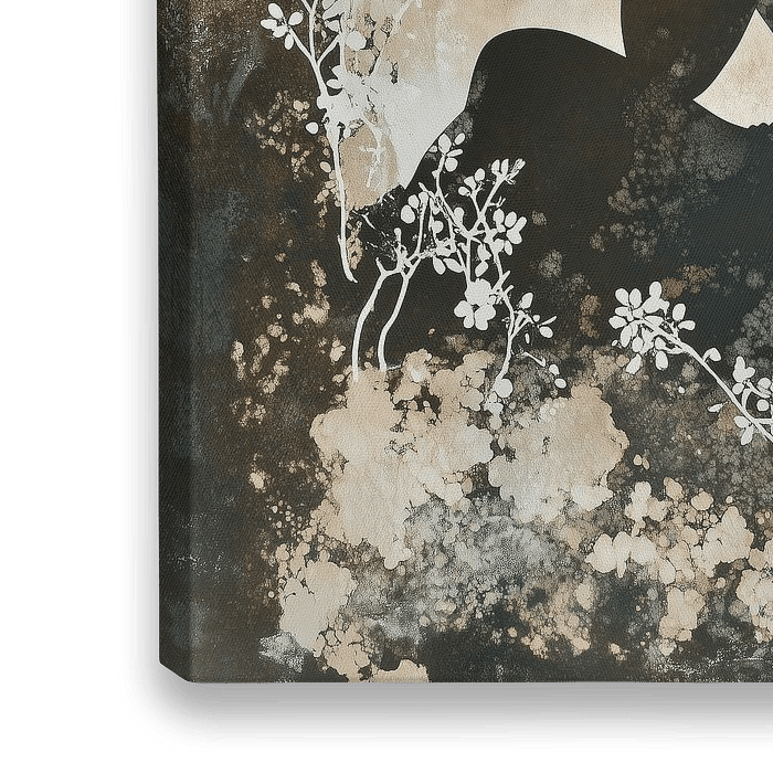 In een serene compositie zit een vrouw in zijaanzicht, haar silhouette donker tegen een zachte beige achtergrond. Haar houding straalt een gevoel van contemplatie uit, alsof ze wegdroomt in een andere wereld. Om haar heen dansen kleine, witte bloemetjes, die een delicate tegenstelling vormen met de grijszwartbruine achtergrond. Deze…