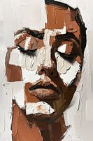 Deze afbeelding toont een close-up portret van een vrouw met gesloten ogen, vastgelegd in een abstracte, kubistische stijl. Hoewel het een digitaal gegenereerd beeld is, wekt het de indruk dat het is geschilderd met dikke, expressieve penseelstreken. Deze penseelstreken variëren van warme bruintinten tot koele witte en grijze tinten. De techniek die wordt nagebootst, lijkt op een impasto-stijl, waarbij de verf dik op het doek wordt aangebracht om textuur en diepte te creëren. De zachte, maar krachtige contrasten benadrukken de serene en introspectieve uitdrukking van de vrouw.