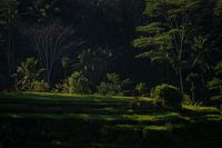 Tegallalang rijstveld in Bali tijdens zonsopkomst. Dromerige sfeer. Zonnestralen lichten het vers groen van de rijstterras en bomen. Rijstvelden in Ubud.