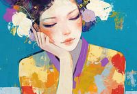 Dromerige Vrouw - Op dit vrouwen schilderij zie je een vrouw met een dromerige uitstraling, met een kleurrijke kimono en een stralende blauwe achtergrond, terwijl ze haar hand op haar gezicht steunt en een bloem in haar haar heeft.