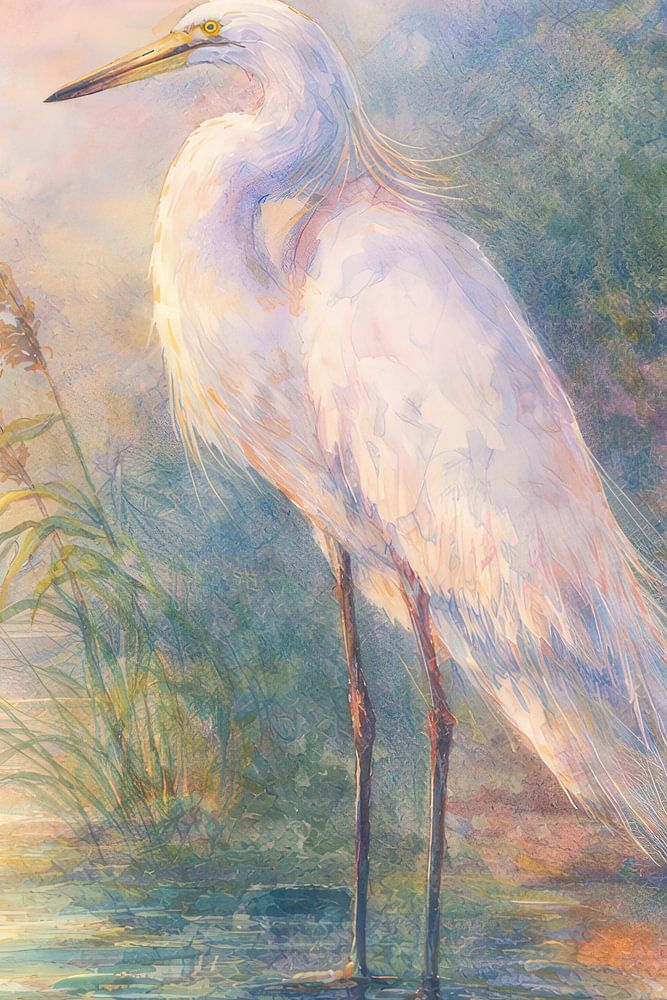 Dromerige Witte Reiger – Zachte Aquarel Natuurkunst van Levente Luca