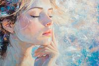 Een delicate, dromerige ziel ontvouwt zich in het zachte licht. De huid glinstert met een vleugje pastel, terwijl de gesloten ogen rust uitstralen. Omringd door mistige kleuren lijken gedachten en gevoelens te blijven hangen in een poëtische stroom, alsof de tijd heeft stilgestaan. Een moment van pure gratie en innerlijke harmonie.