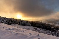 Ik had deze foto genomen op de Wasserkuppe in de Rhöm, deelstaat Hessen. Ik was de hele dag met mijn camera op pad geweest. Het winterlandschap was uniek mooi. Naarmate de zon onderging, veranderden de lucht en het landschap in steeds andere tinten.