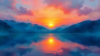 Het licht van de ondergaande zon wordt zachtjes weerkaatst op het oppervlak van een kalm meer, dat werkt als een spiegel en de schoonheid van de lucht weerspiegelt. Kleine golven kabbelen zachtjes tegen de oever terwijl de natuur in een vredige stilte verzinkt. Vogels vliegen in de verte, hun silhouetten zichtbaar tegen de heldere hemel, alsof ze het einde van de dag vieren.