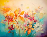 Heldere, veelkleurige bloesems spreiden zich uit tegen een levendige achtergrond. De compositie creëert een dromerige, etherische sfeer.