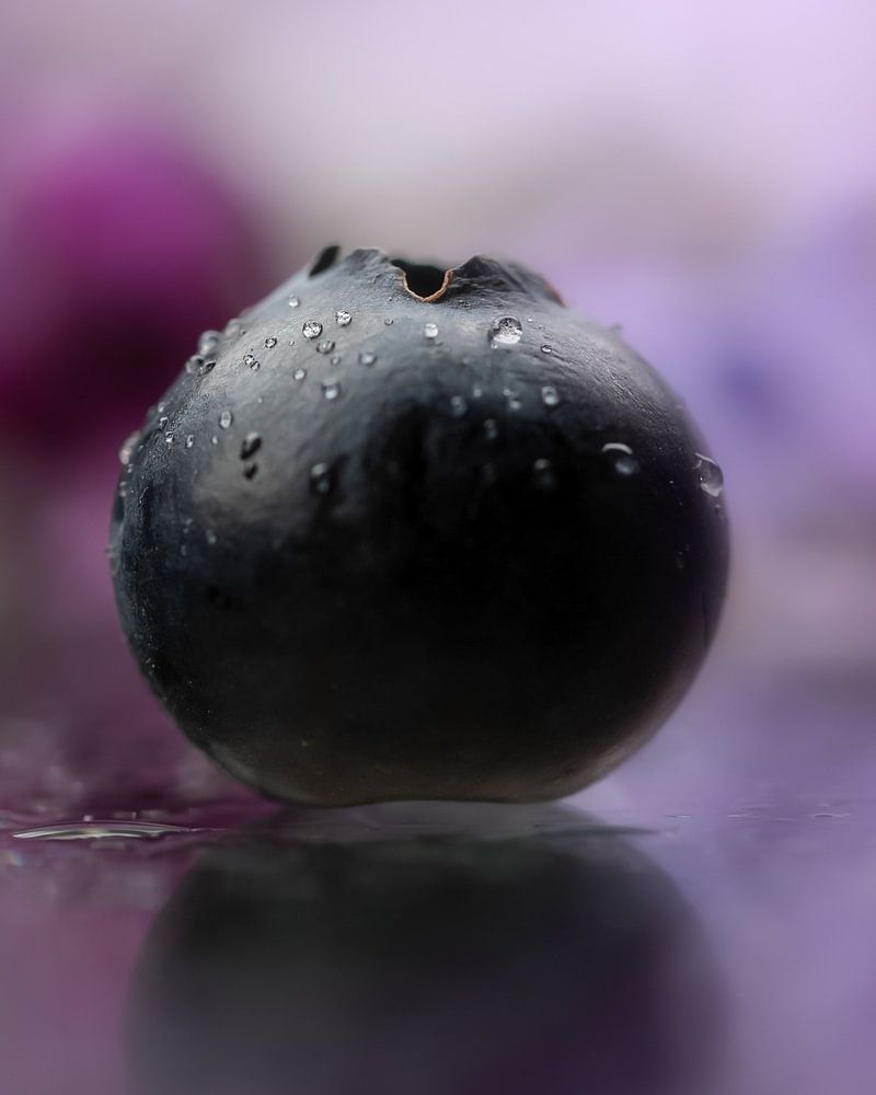 De magie van kleine dingen wordt getoond in deze macro-opname, een "bosbes" natgemaakt door "waterdruppels", zacht ingebed in het licht met een prachtige reflectie, omgeven door een zacht bokeh.
